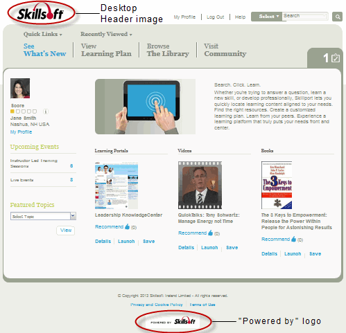 Determines whether or not the "Powered by" logo will appear at the bottom of every Skillport page. Select the Display "Powered by" logo check box to make the logo display in the Skillport interface. Clear the check box to remove the logo. |