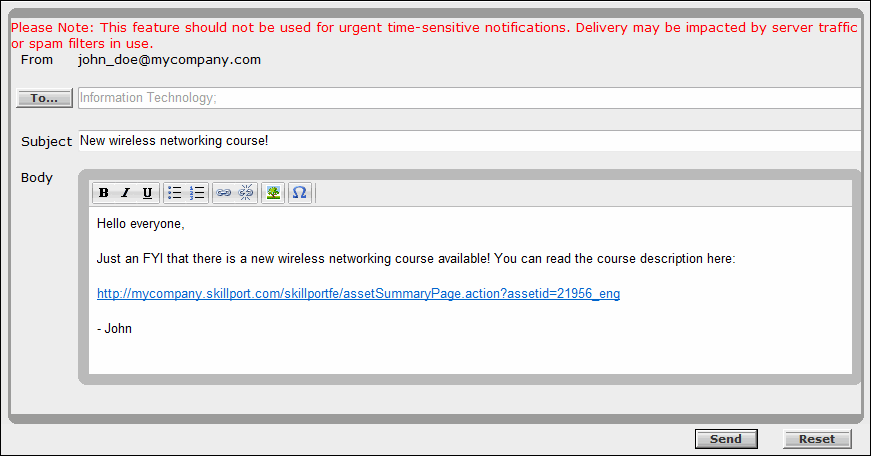 If it is enabled on your site, you can use the Send Email page to send an email to a combination of individual users and group members. Emails sent through the Skillport system are not stored within Skillport for accessing at a later date; as an alternative, include yourself as one of the recipients so you receive and can retain a copy in your default email application.