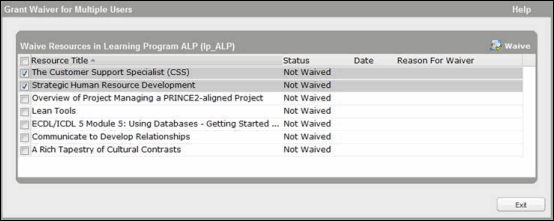 - Click OK. The Waive Resource dialog box closes, and the Grant Waivers to Multiple Users dialog box updates to reflect the granted waivers.