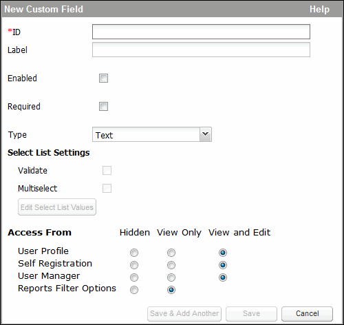 Ensure that you enter a meaningful label since it is displayed in several places in Skillport, including the Self-Registration page, the Manage User Profile Fields page, the New User and Edit User dialog boxes in User Management, and in reports.