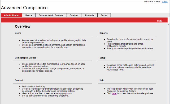 Help for instructions on how to use the Advanced Compliance Administrator.