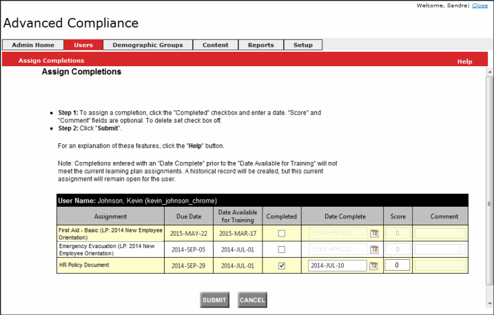 If you have made a learning plan assignment with a non-web-based training (non-WBT) delivery method (such as video, classroom, or CD), you can record a training completion for individual users.