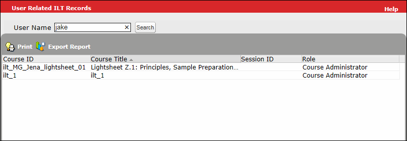 The User Related ILT Records page provides information about what ILT role a particular user has been assigned for specific ILT courses/sessions. From this page, you can also print the results or save the results in .csv format.
