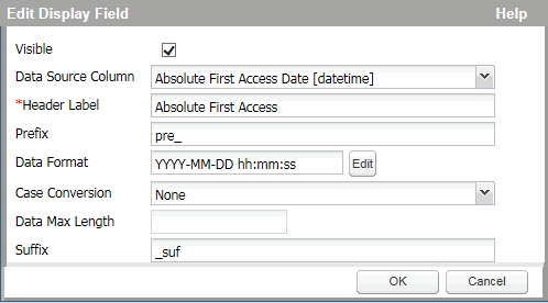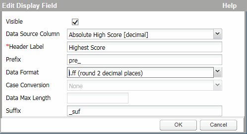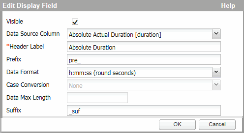 The Data Source Column drop down lists all the columns that can be included in the report, and indicates the type of data returned. The data type determines which fields in the Edit Display Field dialog are enabled or disabled, and in some instances, how the data within the field can be formatted. For instance, the Data Format field includes different options for a decimal based column than it does for a datetime based column.