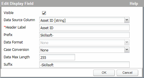 Prefix - Adds identifying information to the beginning of the returned data. For example, if you want to flag assets that are from Skillsoft, you could add Skillsoft-to the Prefix field in an Asset ID column. If the courseID in Skillport is COMM_01_A01_ENUS, the data in the results would be Skillsoft-COMM_01_A01_ENUS.