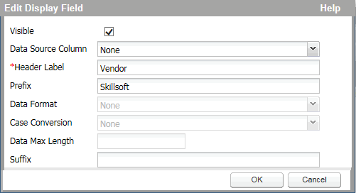 A static based column with no data source (None) allows you to create a column that is populated with a fixed value of your choosing. For instance, you could create a column for Vendor and populate it with the value "Skillsoft." There are no additional enabled fields.