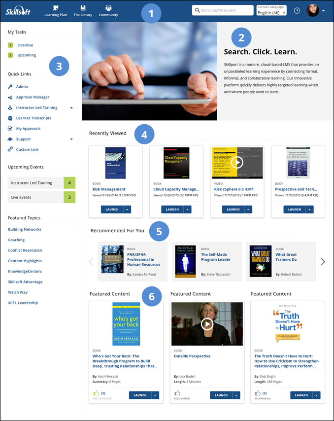 - Featured Topics which, if enabled, lists specific courses or other content your organization chooses to highlight. Click any of the selections in the drop-down list to view more details.