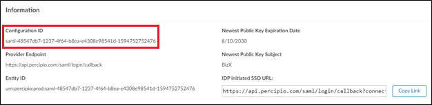 2. After choosing a data center and URL, locate your Skillsoft Percipio Platform Configuration ID by going to Settings > System Integration > Single Sign-on (SAML SSO).