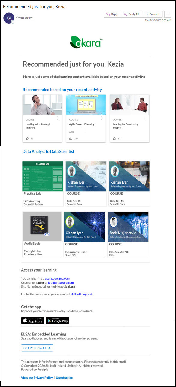 A new Engagement setting allows you to enable or disable user names and email addresses in Percipio email. If your organization uses a single sign-on system with Percipio, you may choose to disable including user name reminders in any Percipio email such as welcome email, recommendations, and so on.