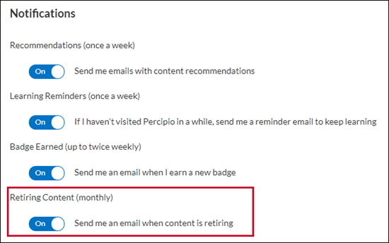 If you are an administrator who has access to the Skillsoft Content Status report and receive the monthly Retiring Content email, you can now set your individual preference to receive the email in the Mobile App settings. This setting applies only to you.