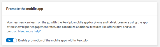 A new Engagement setting allows you to enable or disable the promotion of the Skillsoft Percipio Platform mobile app on the sign in page, in the footer of pages, and in emails.