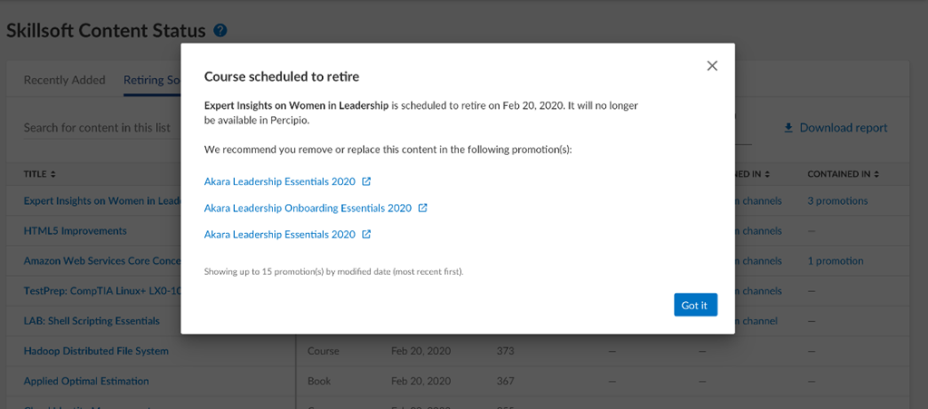 The Skillsoft Content Status report, which lists soon-to-be retiring content, now includes links to see where retiring content displays in promoted content: