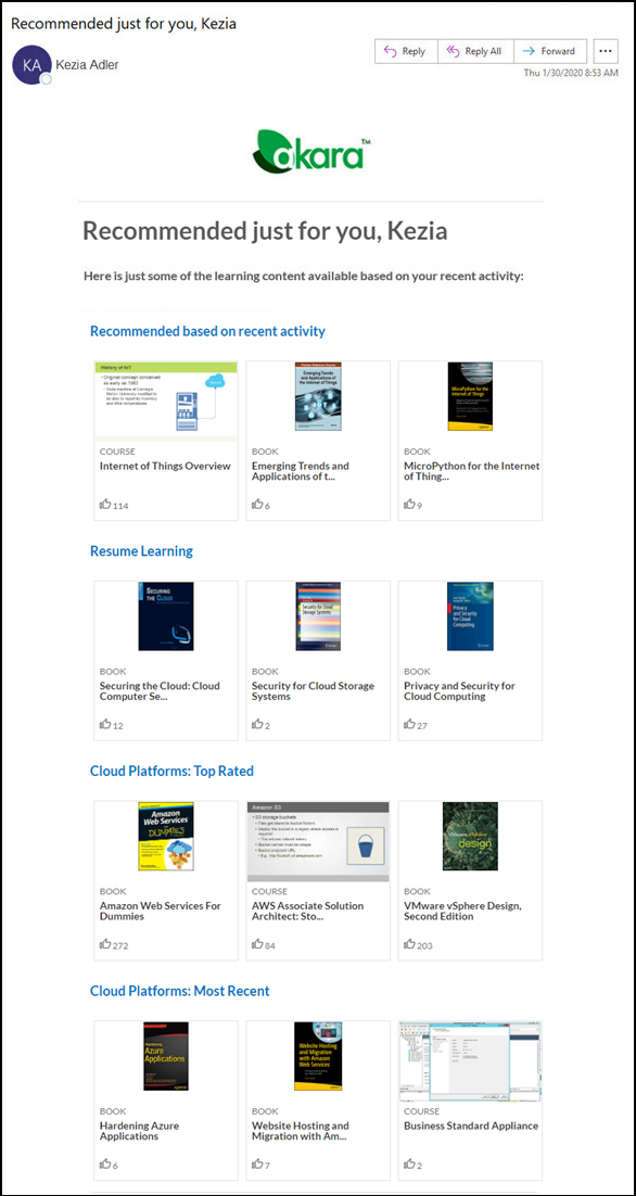 Recommendation emails now include suggested content based on a learner's recent activity.
