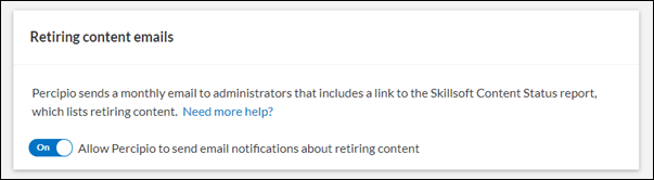 If you are an administrator who has access to the Skillsoft Content Status report and receive the monthly Retiring Content email, there are two settings to control the email.