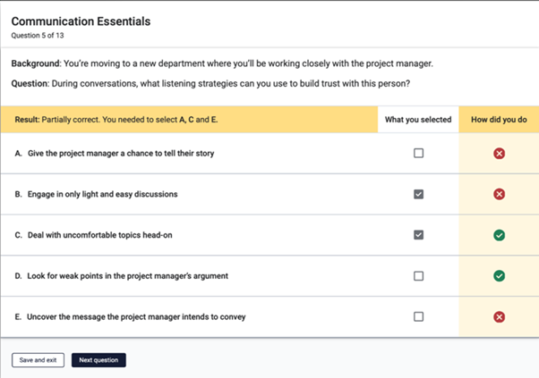 - Improved learner experience: Learners now have the benefit of more visible attendee questions, flexible transcript options, and improved scoring layout to support meaningful practice.