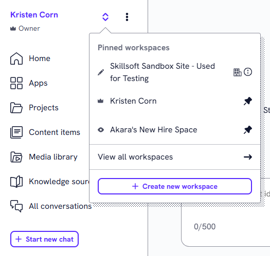 Before you begin creating projects and content, ensure you are in the correct workspace. By default, your personal workspace is the active one.