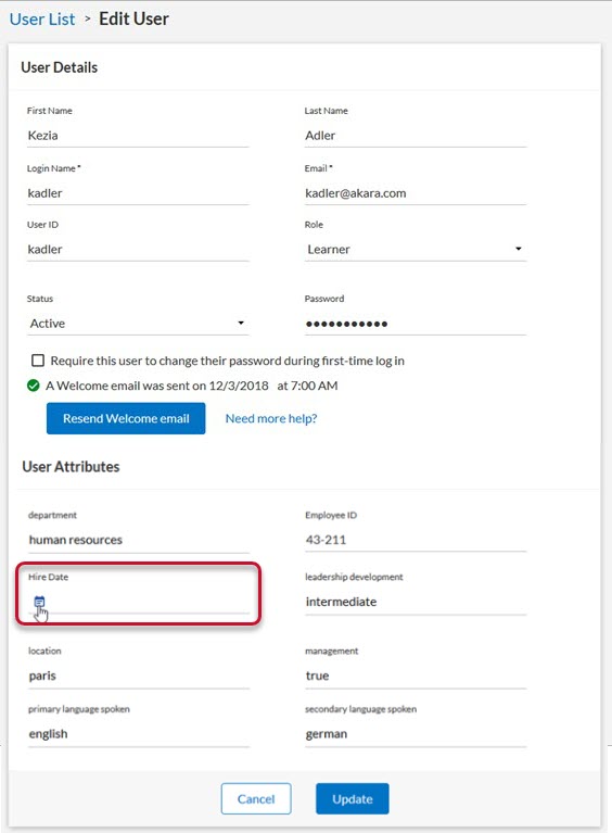 . The Edit User page displays. - In the User attributes section, in the Hire Date attribute field, click