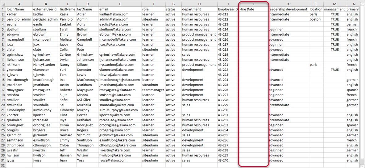 - For each user, in the Hire Date user attribute column, enter the user's hire date in one of the approved formats: