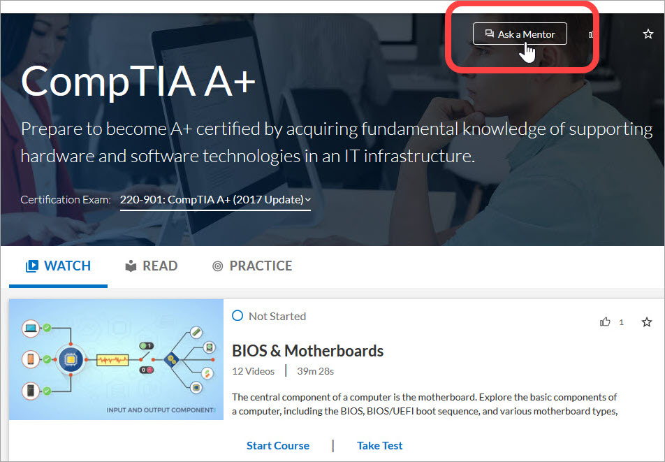 Some channels and courses have the Ask a Mentor feature. You can chat with or email a live mentor about your certifications or courses.