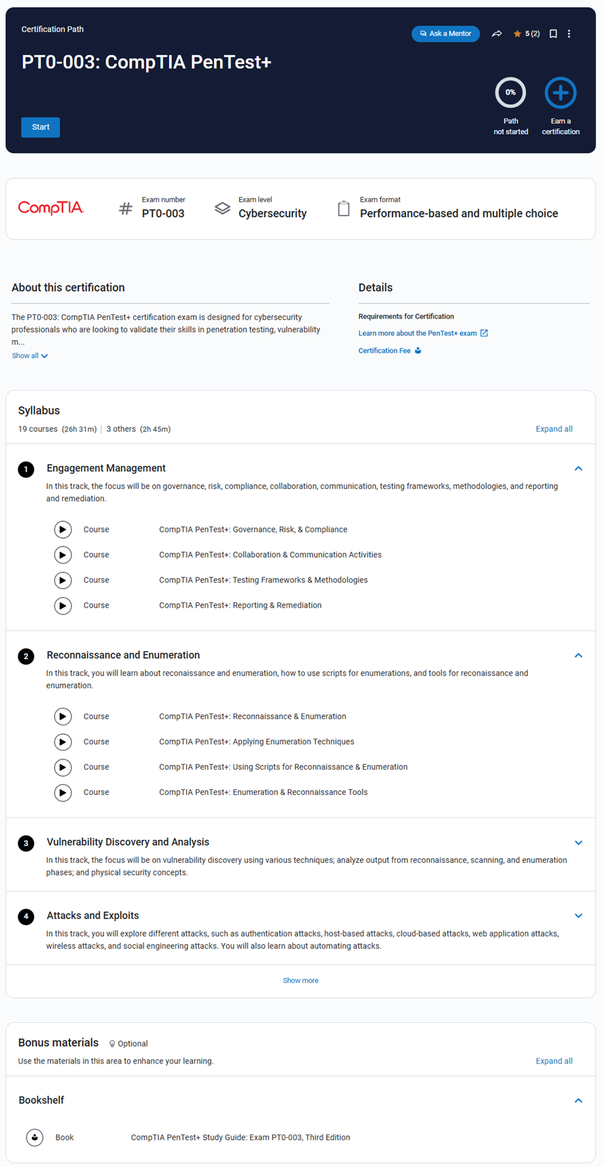 • With the Concise style, you see the journey in a syllabus format with optional bonus material at the end. You can expand each track to see its content and when you launch content, it displays in the same tab. These journeys are set up with milestones and when you achieve one, you get a pop up letting you know that you completed a milestone. Most Skillsoft certification paths are built using the Concise style and may require you to upload your certification credentials as a separate activity in order to complete the journey.
