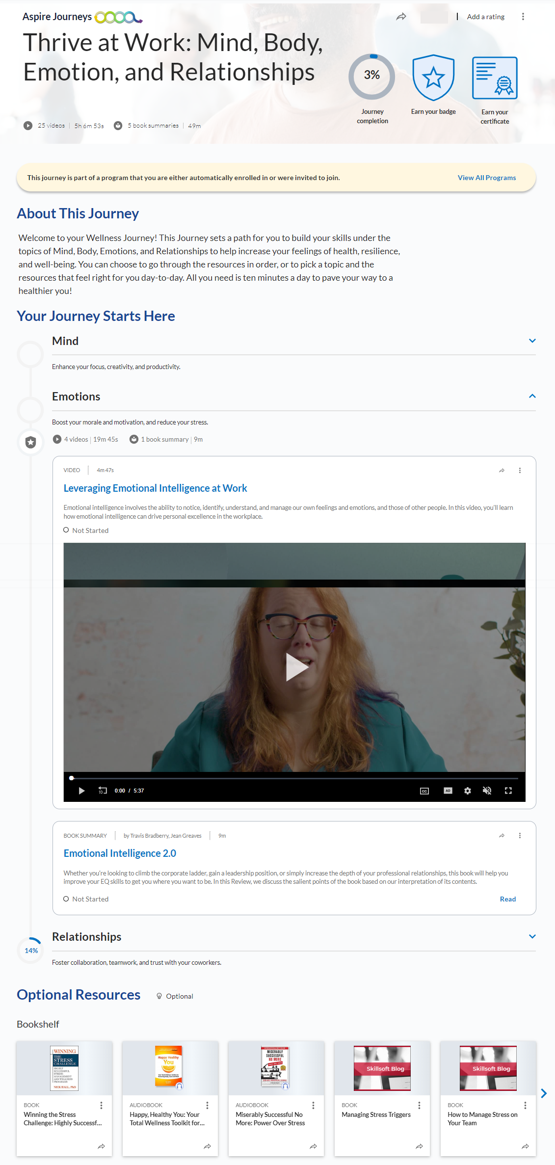 • Aspire Journeys are guided learning paths designed and published by Skillsoft. The learning path comprises tracks of content in a recommended order. Completing all content within a track, completes the track. Completing all tracks within the journey, completes the journey.