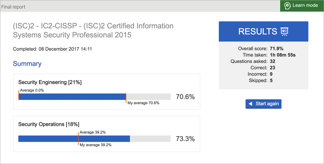 Learn mode displays your overall score, time taken, number of questions in the exam, and the number of questions answered correctly, incorrectly, or skipped.