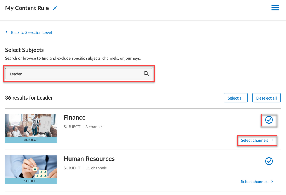 next to each content item indicating the content is included by default. - Using the interface, browse or search to find the areas, subjects, or channels you do not want to include. When working within All Collections, you can only unselect full collections, content types, or languages.