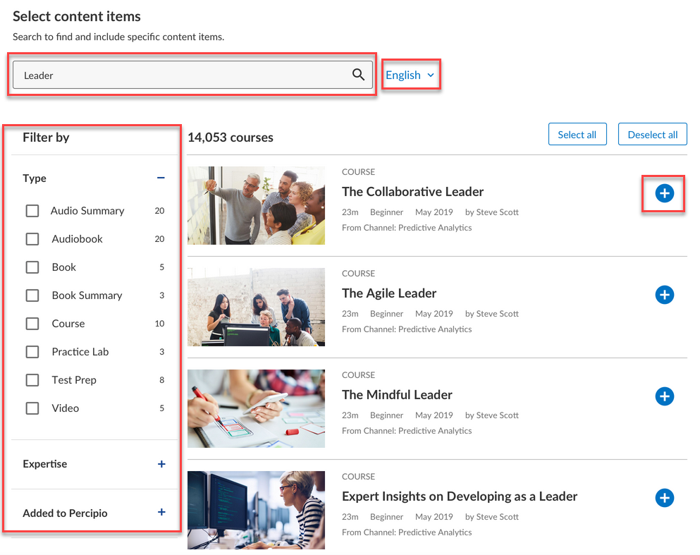 . - Using the interface, find the content you want to include by browsing the list or searching. When searching for content items, you can apply filters for language, type, and expertise to narrow your search.