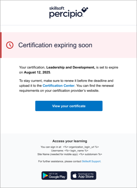 - Renewal emails to the learner when it is time for a learner to renew their certification.