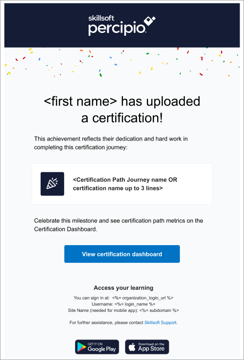 - Congratulatory emails to both the learner and their manager when the learner completes the certification path and uploads their certificate.