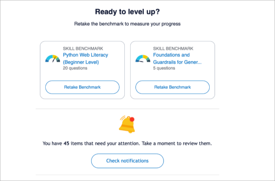 - Skill benchmark retake reminder: If the learner completed a skill benchmark and did not achieve at least a 96% proficiency, they also see a reminder to retake it so they can gauge their progress. The reminder to retake a skill benchmark only shows after the specified retake interval has passed.