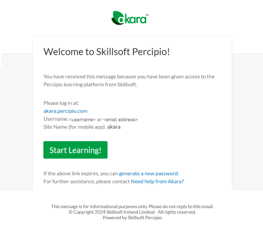 Only learners receive this type of welcome email. Any other Percipio user role who receives a welcome email, is provided a link to the site, a username, and will require a password.