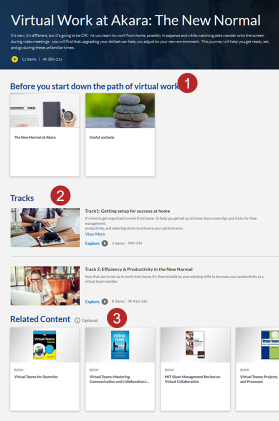 - Related Content: Learners see any supplemental material. Content you might consider sharing here include reference books, job aids, company policy or procedure documents, or a final self evaluation so learners can gauge progress. Items in this part of the journey are optional and do not count toward completion of the journey. You do not have to have a Related Content section.