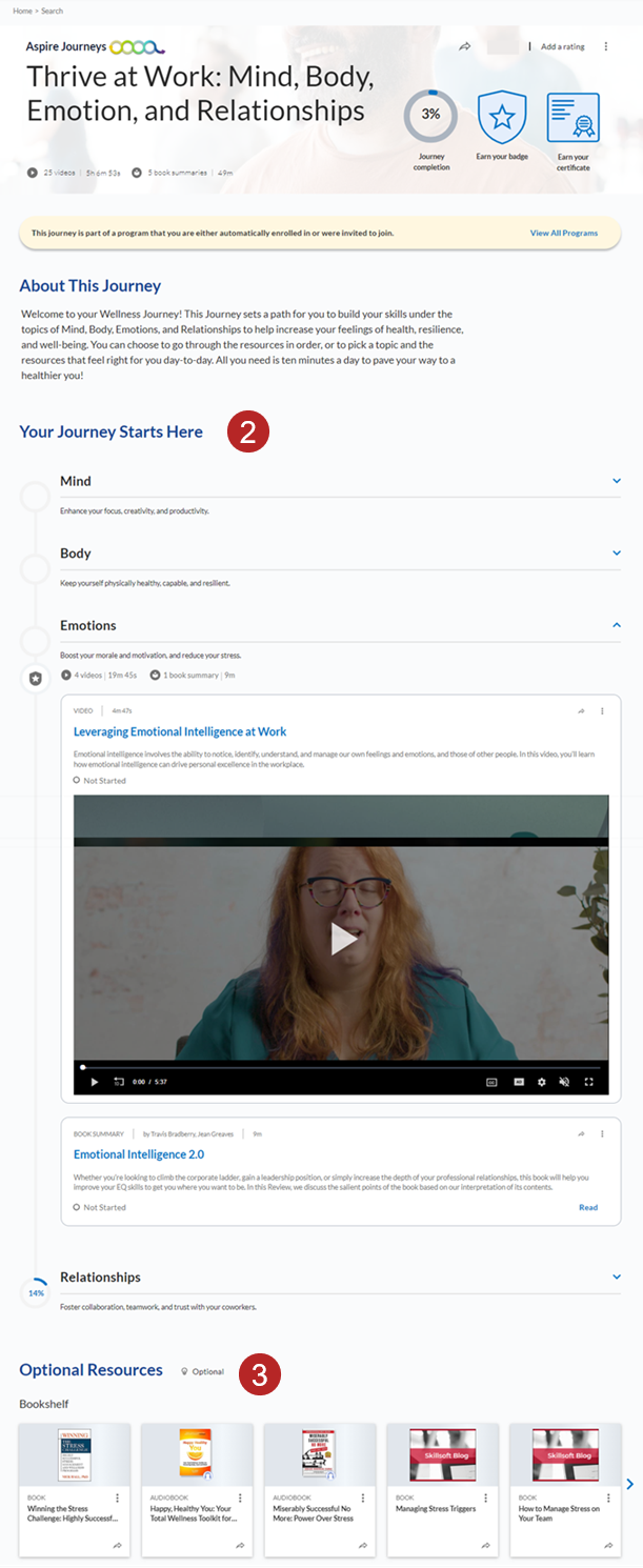 In the Classic theme, you see the three parts on a single page, but each track opens on a separate page. If you choose the Simple theme, each track expands and collapses on the journey page and single videos play inline. The Concise theme is designed to support a certification path with numbered steps and limited images.