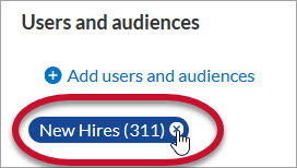 Note: Prior to removing audiences and learners, save your assignment. Removing audiences and learners is an immediate action, and the only way to undo it is to click Cancel, which will not save any of your modifications.If you need to remove users or audiences from an assignment, cancel it for them. If you select the X next to a user or audience, it does not remove them from the assignment.