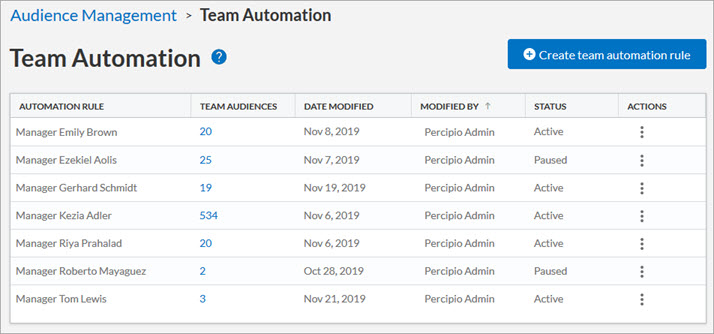 Team automation simplifies the process of creating multiple audiences and assigning audience owners in the platform. Use team audiences to: