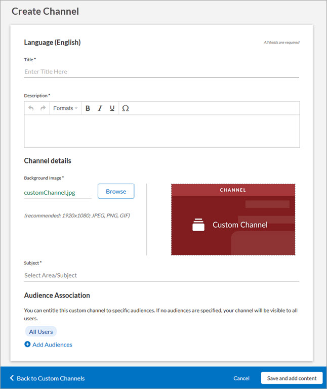 Note: If you do not select an audience, the custom channel displays to all learners via the All users audience. If a learner is not entitled to content in the custom channel, an error message displays to them instead of the asset. To avoid this, select one or more audiences associated to the license pool in which the channel's content is included. -
