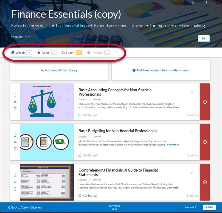 • Publish:  Publishes your channel to Percipio, and places your channel into a Published status. By default, the custom channel is associated to the All Users audience. If you do not want all users in your organization to access the content within your custom channel, associate the custom channel to another audience.