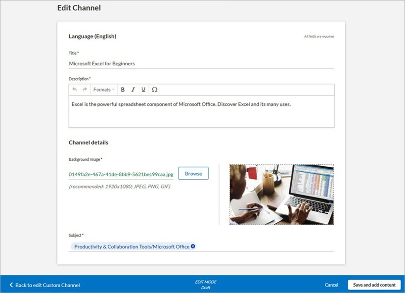 - Click Save and add content. The channel page displays.