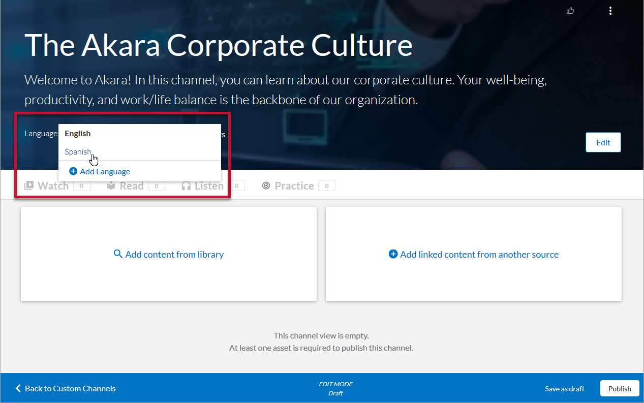 A new channel view is added for each selected language. - In the Language drop down, select the language view you wish to edit.