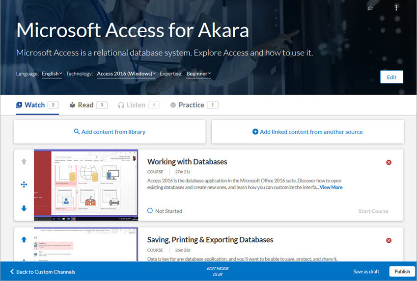 - Publish: Publishes your channel to Percipio, and places your channel into a Published status. By default, the custom channel is associated to the All Users audience. If you do not want all users in your organization to access the content within your custom channel, associate the custom channel to another audience.Note: It may take several minutes for the channel to display in the library and in search results.