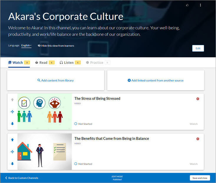 - Publish: Publishes your channel to Percipio, and places your channel into a Published status. By default, the custom channel is associated to the All Users audience. If you do not want all users in your organization to access the content within your custom channel, associate the custom channel to another audience.Note: It may take several minutes for the channel to display in the library and in search results.