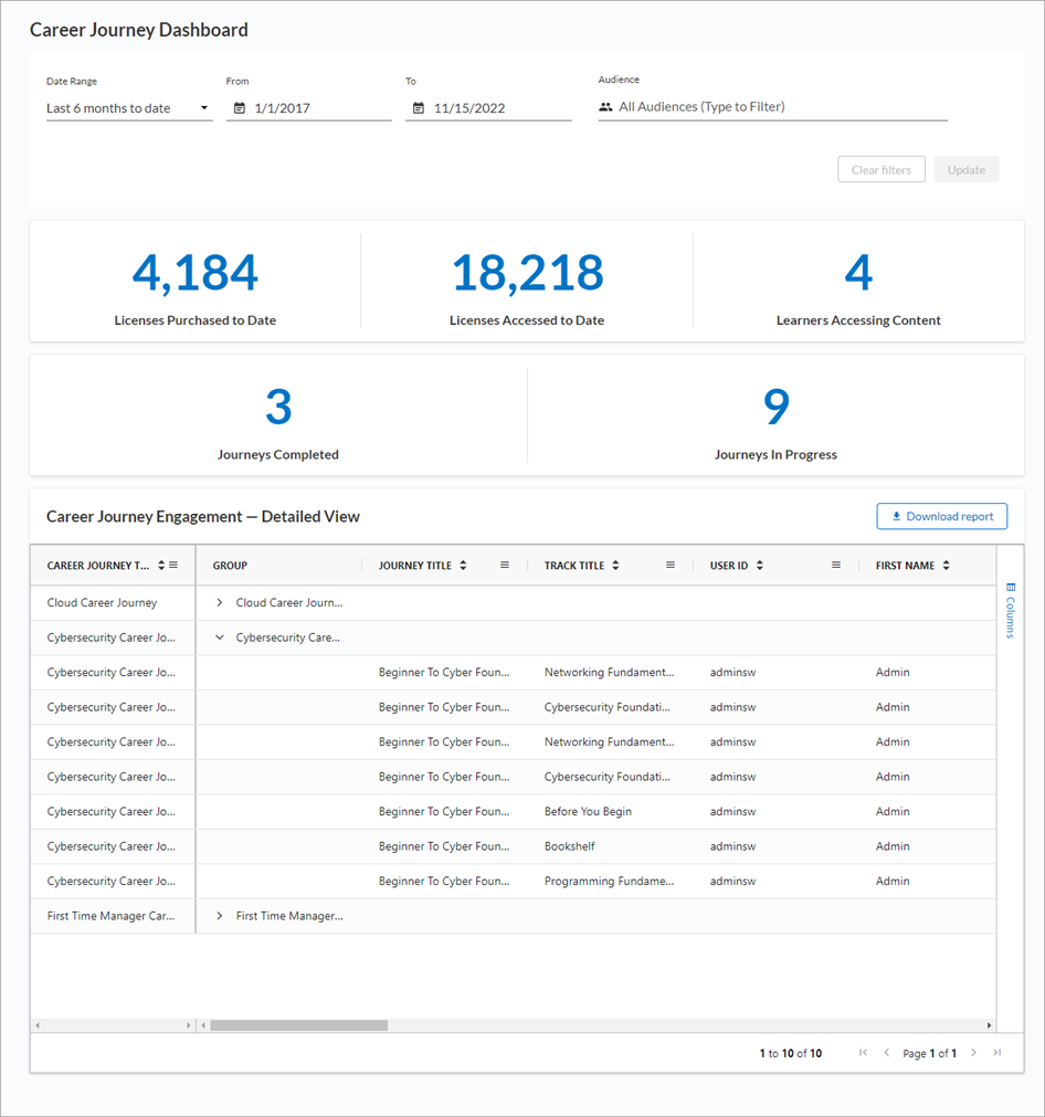 Career Journeys blend live, on-demand, hands-on, and collaborative learning methods into one topic-specific skilling program. Each Career Journey enables learners to master mission- and job-critical skills and drive meaningful business transformation year-after-year. Career journeys comprise specially curated Aspire Journeys. If you added any of the available Career Journeys to the platform, you can now assess its value through the Career Journey dashboard. You can answer questions such as: