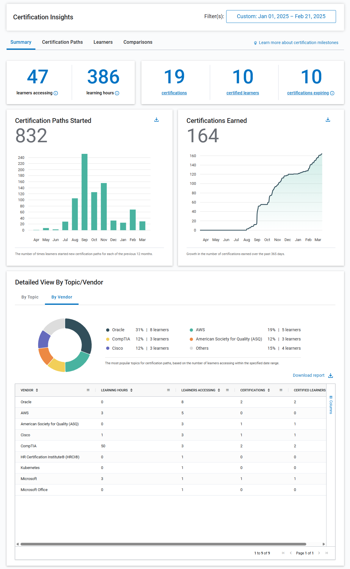 • Certification paths started and completed: Understanding which certifications are most accessed by learners helps you identify high-demand skills and areas of interest. Use this information to prioritize and promote certifications that are most relevant to the organization's growth and to tailor future certification programs to better align with learner interests and business needs.