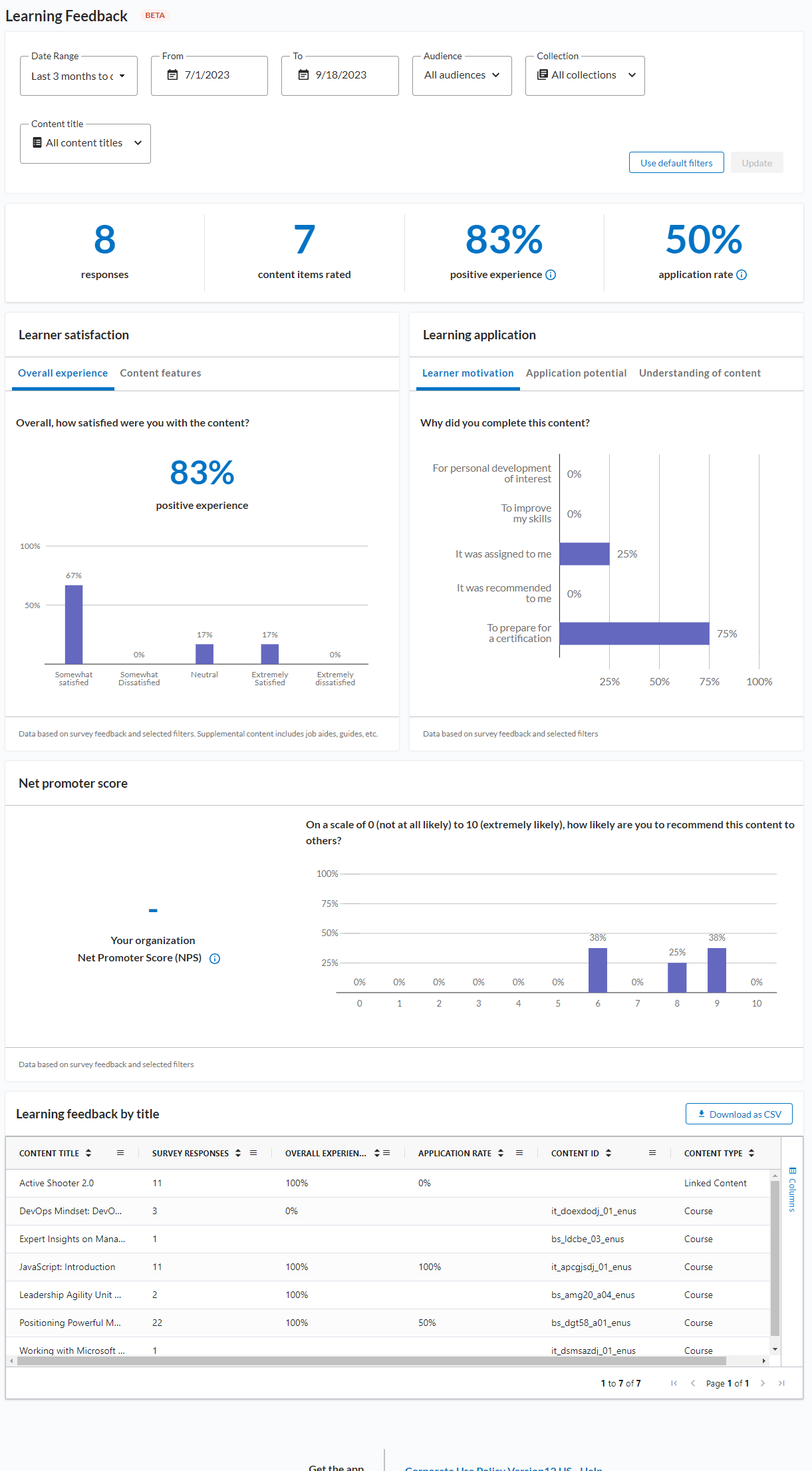 • Whether the content is meeting learner expectations. If you have a positive experience rating higher than 80%, you can feel good about the experience your learners are having.