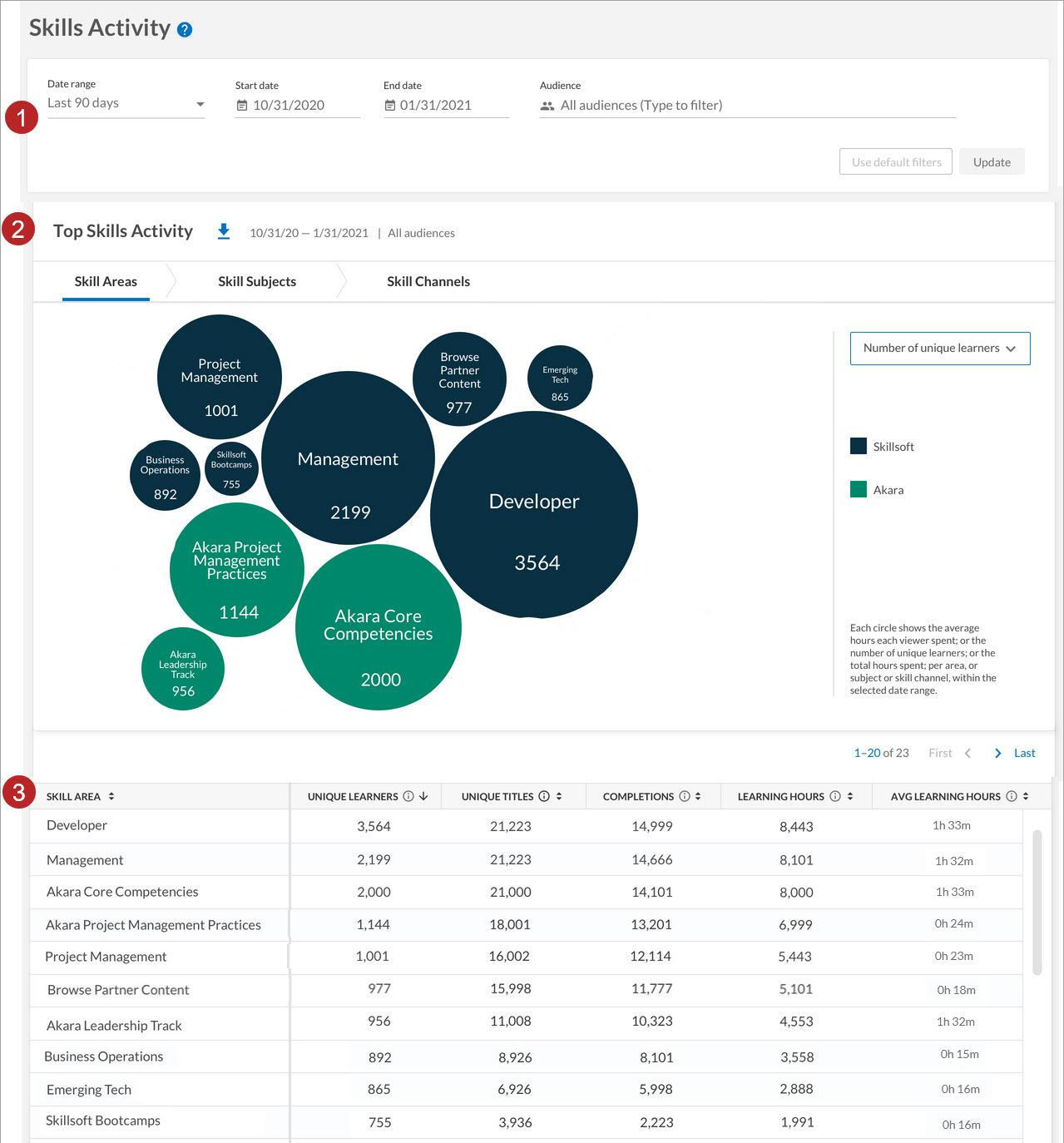 The data in the table provides additional detail for the circles in the Top Skills Activity section. A content item may exist in more than one area, subject, or channel. Activity against one items impacts all areas, subjects, and channels where it resides. The table updates to correspond to the tab selected.
