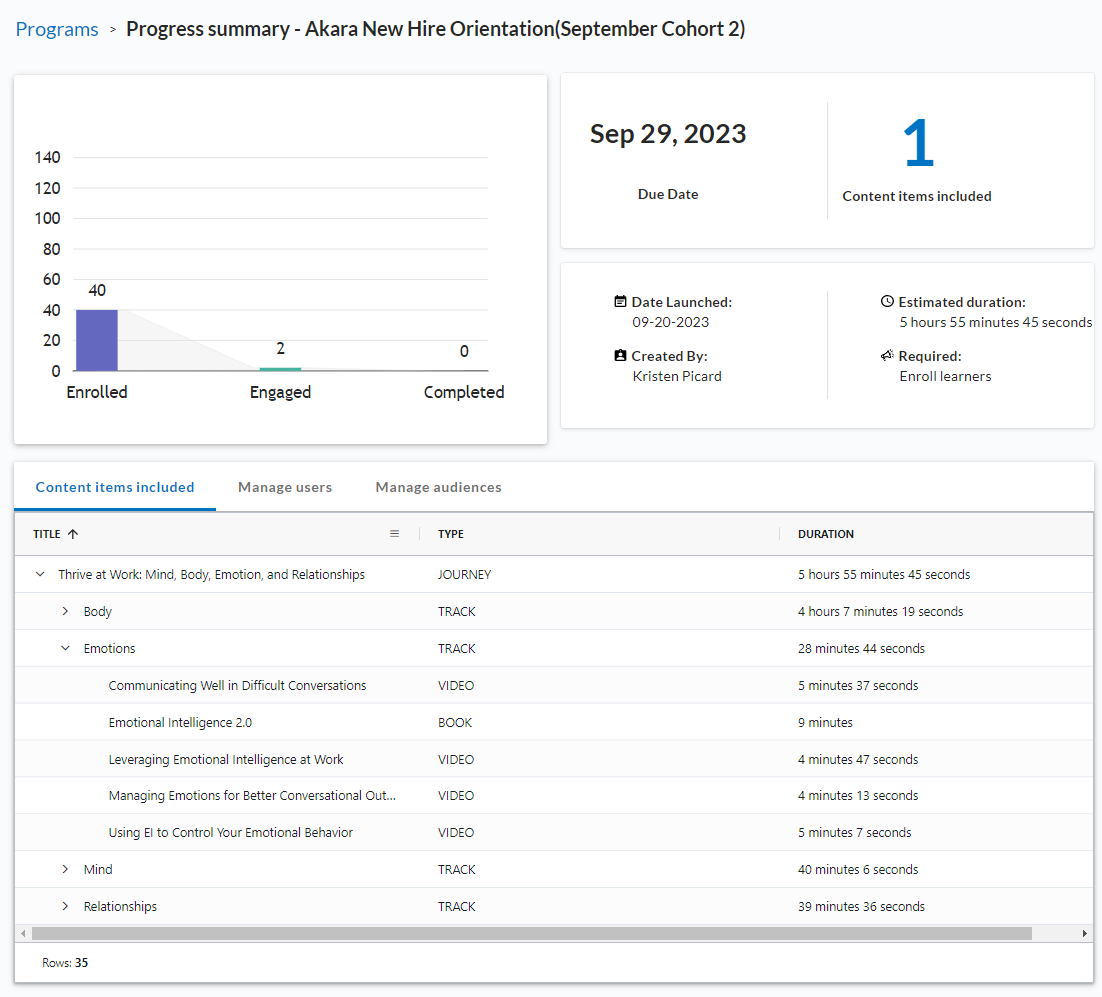 - Estimated duration: Total estimated amount of time a user needs to complete the specified content in the program. Time is listed in (00h00m00s) format.