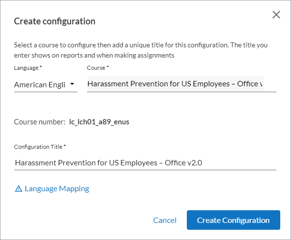 Note for Multiple Configurations: If you want to assign the configured course only once using the English version and allow the learner to automatically see the configuration in their own language, you must also supply Skillsoft with a language mapping that shows which configurations correspond to each other. If you do not supply the language mapping, learners see the English version of the configuration.