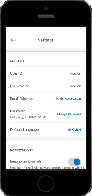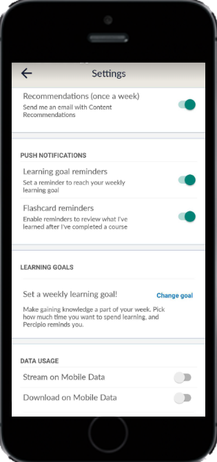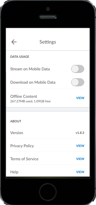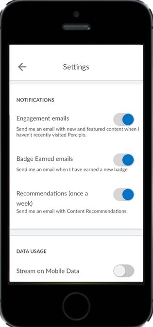 Mobile app settings allow you to configure how the platform behaves on your mobile device. To access settings: select the my profile icon, add to playlist button, blue outlined star, and choose Settings. From Settings, you see: