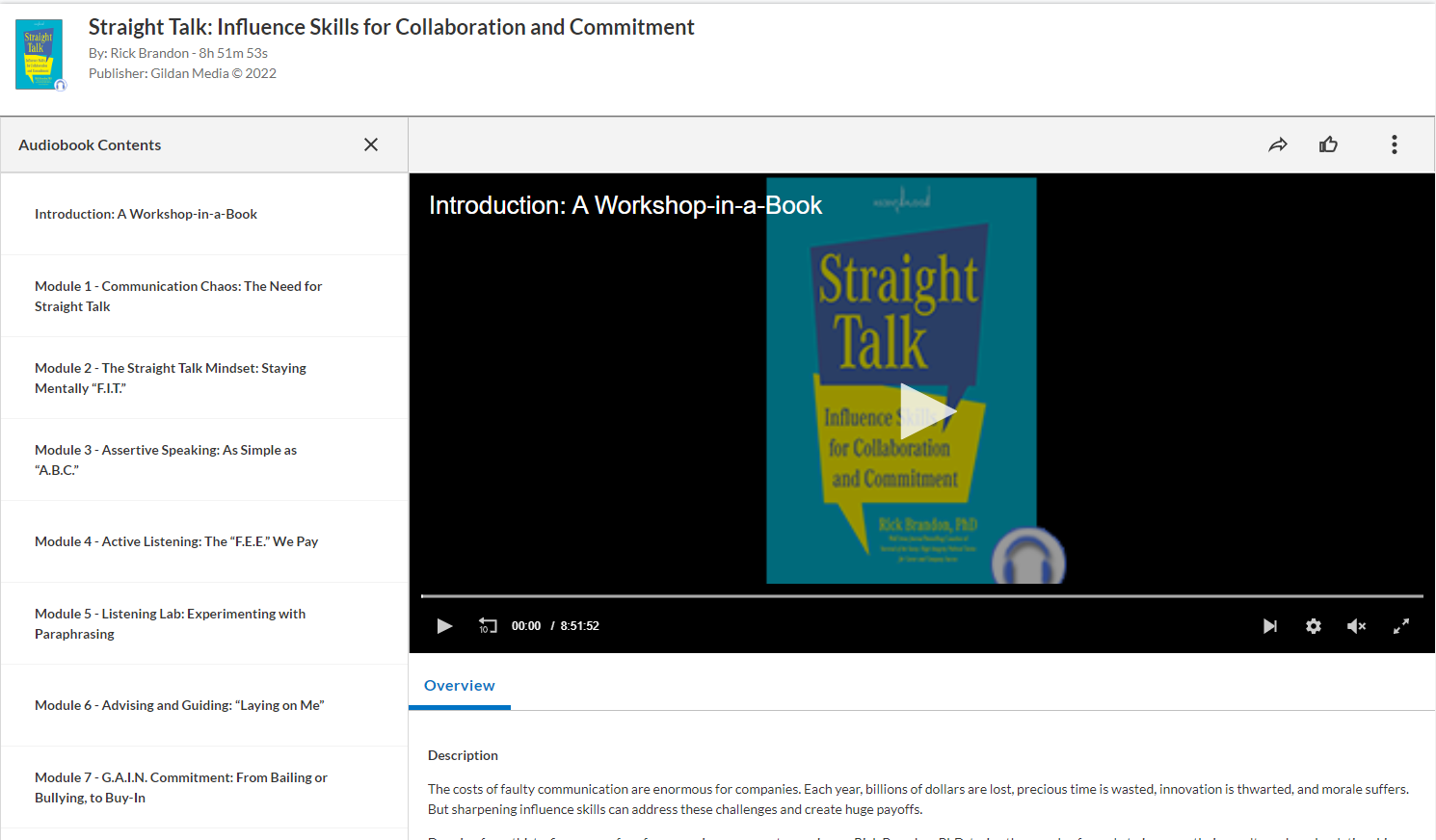 4. Overview: The Overview tab displays a brief overview of the audiobook's content, expertise level, and ISBN.
